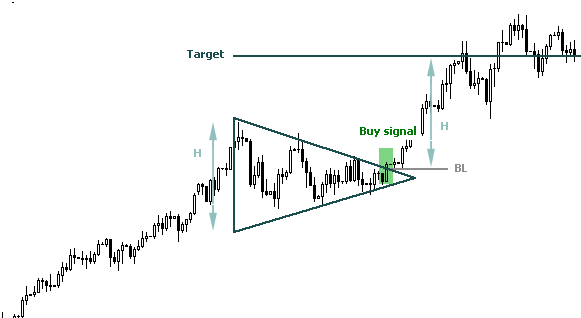 - نحوه معامله: در این الگو، معاملهگران معمولاً منتظر شکست خط روند بالا یا پایین هستند تا وارد معامله شوند. اگر شکست به سمت بالا باشد، معامله خرید (Buy) و اگر به سمت پایین باشد، معامله فروش (Sell) انجام میشود.
