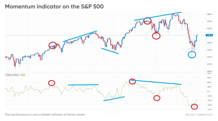 با بررسی چارت و استفاده از اندیکاتور مومنتوم، میتوان به قدرت یک روند پی برد. در صورتی که یک روند صعودی یا نزولی قوی وجود داشته باشد، میتوان گفت که قیمت دارای مومنتوم یا قدرت خوبی است.